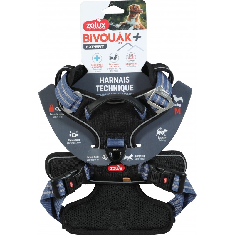 Il est équipé de 2 boucles latérales de sécurité en plastique (avec verrou) et d'une 3ème boucle en métal (boucle aviateur) sur le devant permettant de mettre le harnais sans passer par la tête de l’animal.