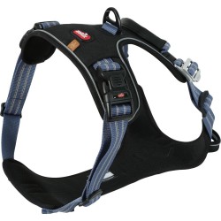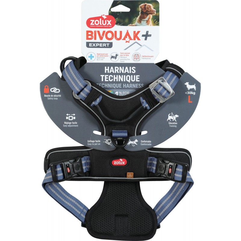 Il est équipé de 2 boucles latérales de sécurité en plastique (avec verrou) et d'une 3ème boucle en métal (boucle aviateur) sur le devant permettant de mettre le harnais sans passer par la tête de l’animal.