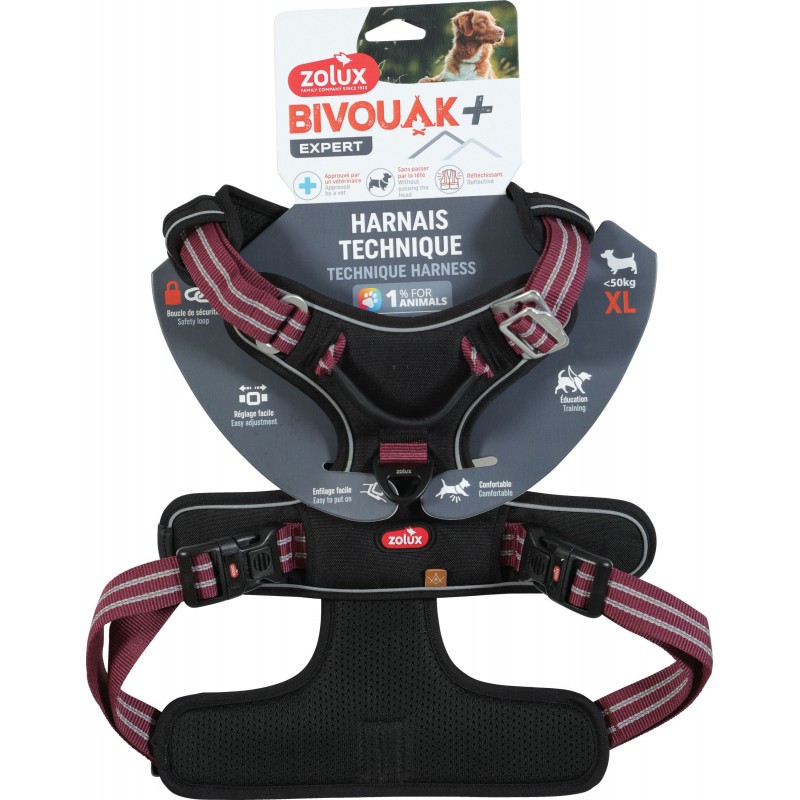 Il est équipé de 2 boucles latérales de sécurité en plastique (avec verrou) et d'une 3ème boucle en métal (boucle aviateur) sur le devant permettant de mettre le harnais sans passer par la tête de l’animal.