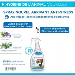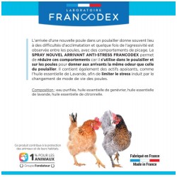 L'arrivée d'une nouvelle poule dans un poulailler donne souvent lieu à des difficultés d'acclimatation et quelque fois de l'agressivité est observée entre les poules, avec des comportements de picage. Le SPRAY NOUVEL ARRIVANT ANTI-STRESS FRANCODEX permet de réduire ces comportements car il s'utilise dans le poulailler et sur les poules pour donner aux arrivants la même odeur que celle du poulailler. Il contient également des actifs apaisants, comme l'huile essentielle de lavande, afin de limiter le stress induit par le changement de mode de vie des poules.