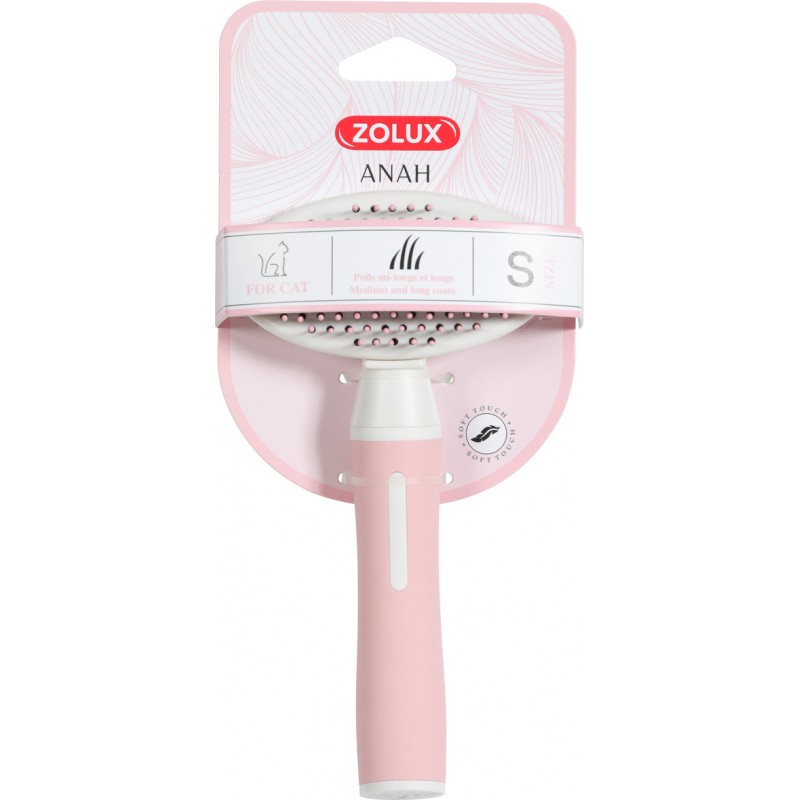 Le slicker doux rétractable pour chat Anah permet le brossage en douceur du sous-poil du pelage grâce à ses picots souples dont les embouts en plastique offrent plus de confort à votre chat. La brosse est facile à entretenir et à utiliser grâce à ses picots rétractables. Le manche ergonomique antidérapant au toucher doux offre plus de confort et une prise en main optimale. Il est idéal pour démêler, supprimer les poils morts et lisser le pelage. Adapté aux poils mi-longs et longs. Disponible en 2 tailles: S et M. Taille S: L9xp5,5xh16,7cm. Taille M: L10,2xp5,5xh18cm.|