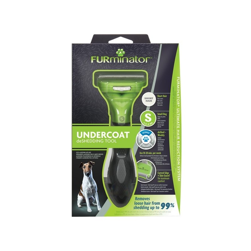 Le FURminator® Undercoat deShedding Tool pour petits chiens (qui pèsent entre 4,5 et 9 kg) à poils courts élimine jusqu’à 99 % des poils morts. À utiliser une à deux fois par semaine, par séances de 10 à 20 minutes, sur un pelage sec. La lame deShedding en acier inoxydable atteint facilement le sous poil pour retirer en toute sécurité les poils morts sans endommager le poil de couverture ni risquer de couper la peau. Skin Guard® glisse sur la peau et évite que la lame ne la touche. Le bord incurvé épouse la silhouette de l’animal pour plus de confort. Le bouton pressoir FURejector® retire les poils morts accumulés lors du brossage pour un toilettage encore plus facile. L’étui de protection de la lame préserve les dents des dommages lorsque l’outil est rangé.|