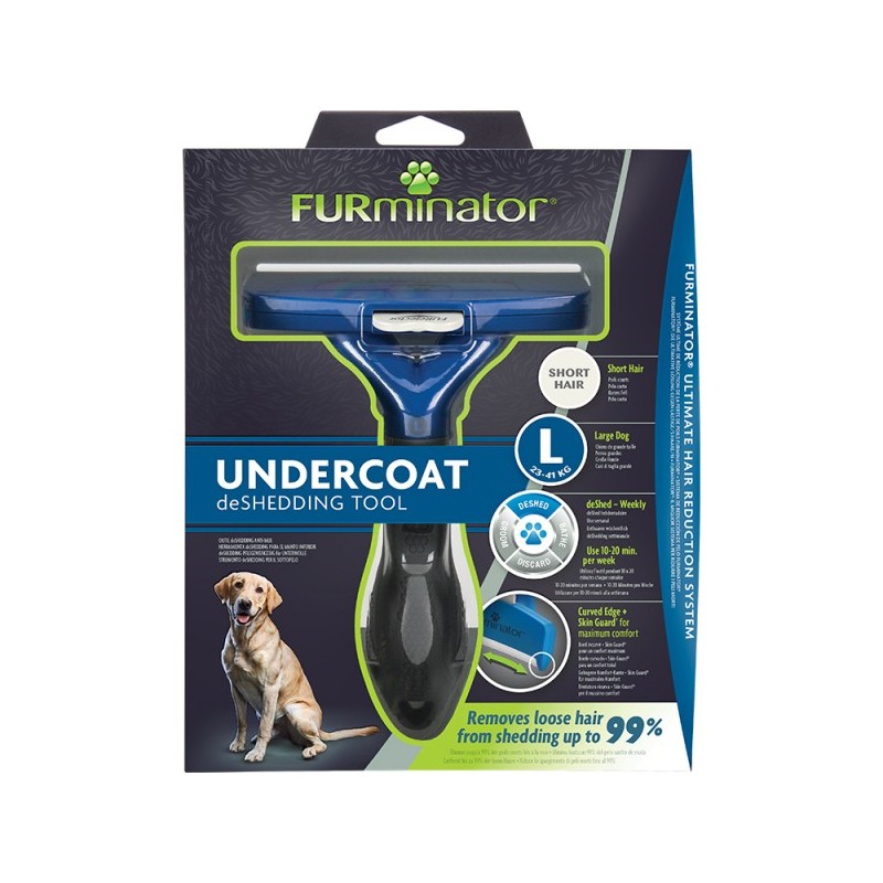 Le FURminator® Undercoat deShedding Tool pour très grands chiens (qui pèsent entre 23 et 41 kg) à poils courts élimine jusqu’à 99 % des poils morts. À utiliser une à deux fois par semaine, par séances de 10 à 20 minutes, sur un pelage sec. La lame deShedding en acier inoxydable atteint facilement le sous poil pour retirer en toute sécurité les poils morts sans endommager le poil de couverture ni risquer de couper la peau. Skin Guard® glisse sur la peau et évite que la lame ne la touche. Le bord incurvé épouse la silhouette de l’animal pour plus de confort. Le bouton pressoir FURejector® retire les poils morts accumulés lors du brossage pour un toilettage encore plus facile. L’étui de protection de la lame préserve les dents des dommages lorsque l’outil est rangé.|