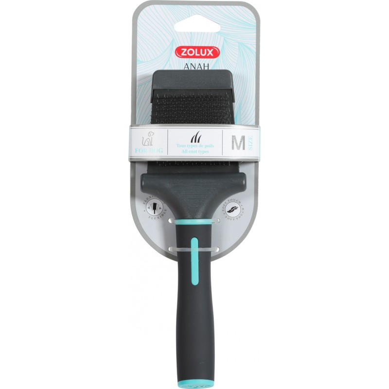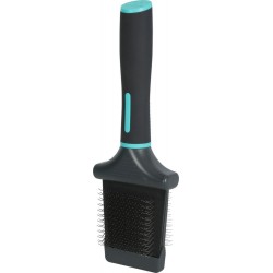 Le slicker Anah double flexible permet le brossage du sous-poil du pelage grâce à ses longs picots souples. La double face s’adapte à tous styles de travail. La tête flexible permet de mieux épouser le corps du chien pour un brossage plus efficace et confortable. Les picots sont en acier inoxydable. Le manche ergonomique antidérapant au toucher doux offre plus de confort et une prise en main optimale. Il est idéal pour démêler, supprimer les poils morts et lisser le pelage. Pour tous types de poils. Disponible en 3 tailles: S, M et L. Taille S: L6,2xp4xh21cm. Taille M: L7,2xp4xh21cm. Taille L: L9,5xp4xh21,5cm.|