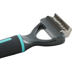 Le peigne démêloir 16 dents Anah élimine et coupe en douceur les petits amas de poils tout en lissant le pelage et le sous-poil il permet de démêler et de désépaissir le pelage. Les pointes arrondies des dents respectent la peau du chien tout en assurant sa sécurité et celle de l'utilisateur. Les lames sont en acier inoxydable. Le manche ergonomique antidérapant au toucher doux offre plus de confort et une prise en main optimale. Il est idéal pour éliminer les poils morts, démêler et désépaissir. Adapté à tous types de poils.|
