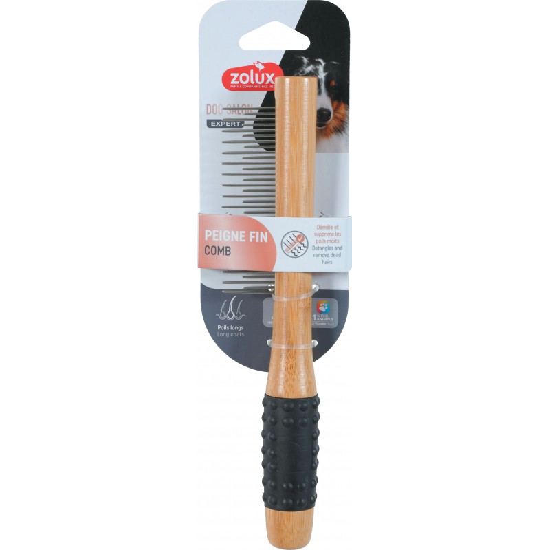 Ce peigne fin en bamboo démêle en douceur, supprime les poils morts et lisse le pelage et le sous-poil. Les crans plus larges démêlent et lissent les poils bourrus pour éviter la formation de noeuds. Les pointes arrondies des dents respectent la peau de l'animal tout en assurant sa sécurité. Le manche du peigne est antidérapant ce qui facilite sa prise en main.