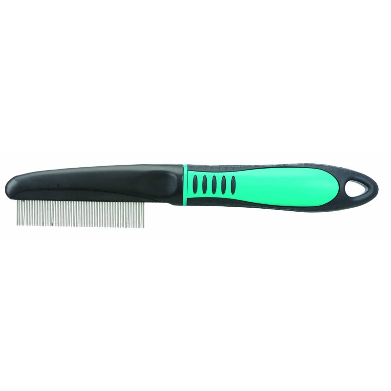 pour detecter puces et poux dents arrondies pour des soins du pelage en douceur manche plastique avec revetement anti-derapant en caoutchouc| MENTIONS OBLIGATOIRES: pour détecter puces et poux poignée en plastique avec revêtement anti-dérapant en caoutchouc/métal