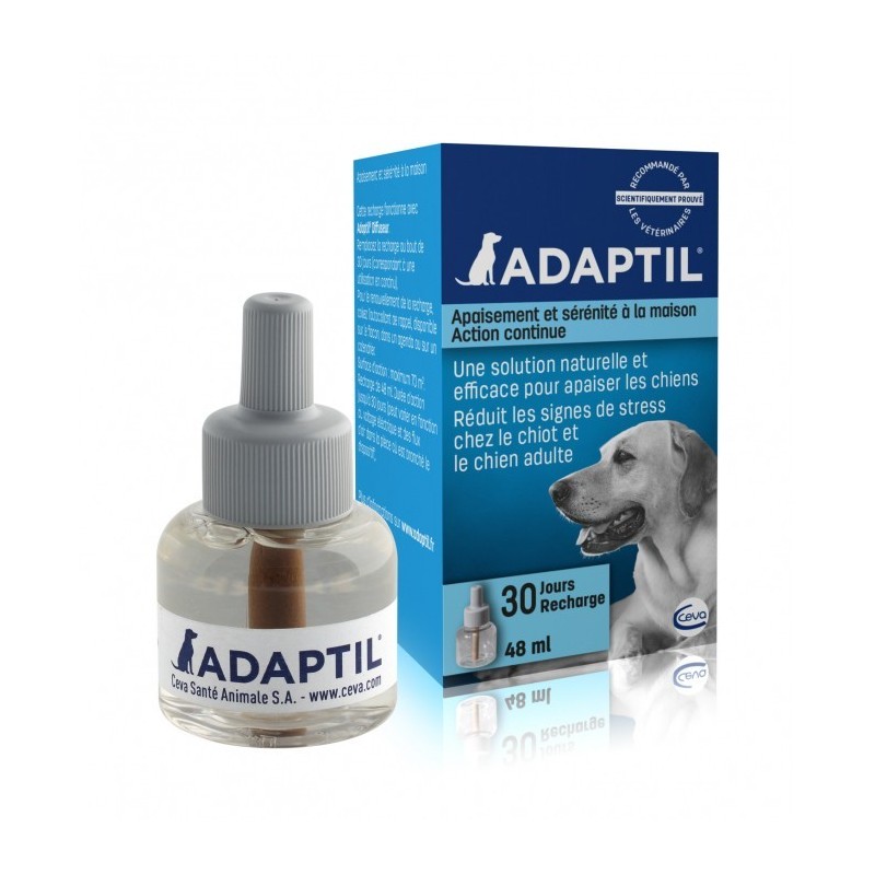 Recharge pour diffuseur de phéromones ADAPTIL. Contient un analogue de la phéromone apaisante canine reconnue pour ses propriétés rassurantes. Convient pour le chiot et le chien adulte. Principales utilisations : nuisances noctures chez le chiot nouvellement adopté, aboiements ou détériorations en l?absence du propriétaire, peur des bruits. Durée d?action : 4 semaines. Fabriqué en France.