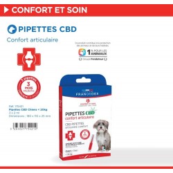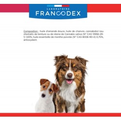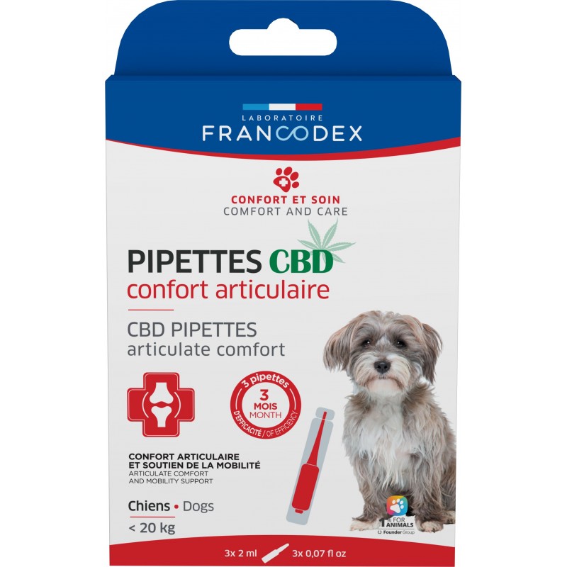 L'âge, les traumatismes, un effort prolongé peuvent gêner les chiens au quotidien dans leurs déplacements. Les PIPETTES AU CBD FRANCODEX contiennent du cannabidiol (CBD), connu pour limiter l'inconfort articulaire et favoriser la mobilité du chien, et de la menthe poivrée qui favorise la détente musculaire. La pipette permet une action immédiate, et continue jusqu'à 4 semaines pour un bien-être rapide et prolongé.
