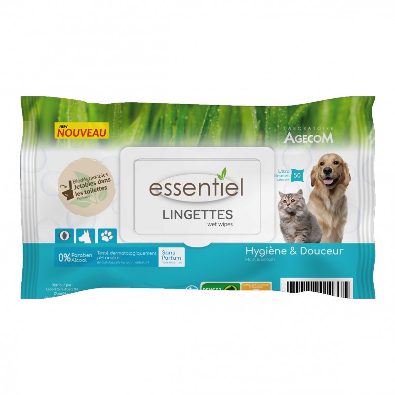 Ultra moelleuses, les lingettes Essentiel, composées à 100% de fibres d'origine naturelle, sans paraben ni alcool, vous permettent de nettoyer tout en douceur votre compagnon, de la tête aux pattes. Entièrement biodégradables, elles peuvent être jetées dans les toilettes sans risque pour la nature ou pour vos canalisations*.*Hors toilettes avec broyeur