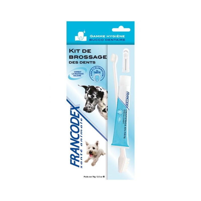 Ce KIT DE BROSSAGE DES DENTS POUR CHIEN aide à combattre l'accumulation de la plaque dentaire et la formation du tartre. Son utilisation est facile grâce à la brosse à dent ergonomique et au doigtier. L'association de 2 agents abrasifs permet de réduire mécaniquement l'apparition de plaque dentaire dans la cavité buccale et limite ainsi la formation de tartre. Il rafraîchit l'haleine et neutralise les odeurs du tube digestif.