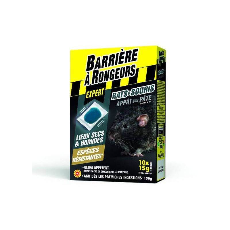 Appât prêt à l'emploi sous forme de pâte conditionné dans des sachets individuels de 15g, bien adapté à l'élimination d'espèces résistances de souris et de rats. Une formulation Expert à base de brodifacoum, matière active anticoagulante qui agit dès la 1ère ingestion et en quelques jours, celle-ci est également enrichie en céréales pour une appétence renforcée même en cas de concurrence alimentaire. Utilisable en intérieur et en extérieur, dans les lieux secs ou humides. Facile d'emploi et très efficace, déposer le sachet sans l'ouvrir dans la boîte appât.|MENTIONS OBLIGATOIRES: