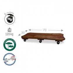 Ce roule plante Bac en bois (Pin maritime des Landes) d’une longueur de 70 cm et d'une largeur de 30 cm dispose de 6 roulettes, il vous permettra de déplacer facilement vos bacs, il supporte un poids maximal de 120 kg. Conçu pour l’extérieur et l’intérieur. Fabrication française. Veillez à répartir le poids uniformément sur le roule plante.|