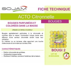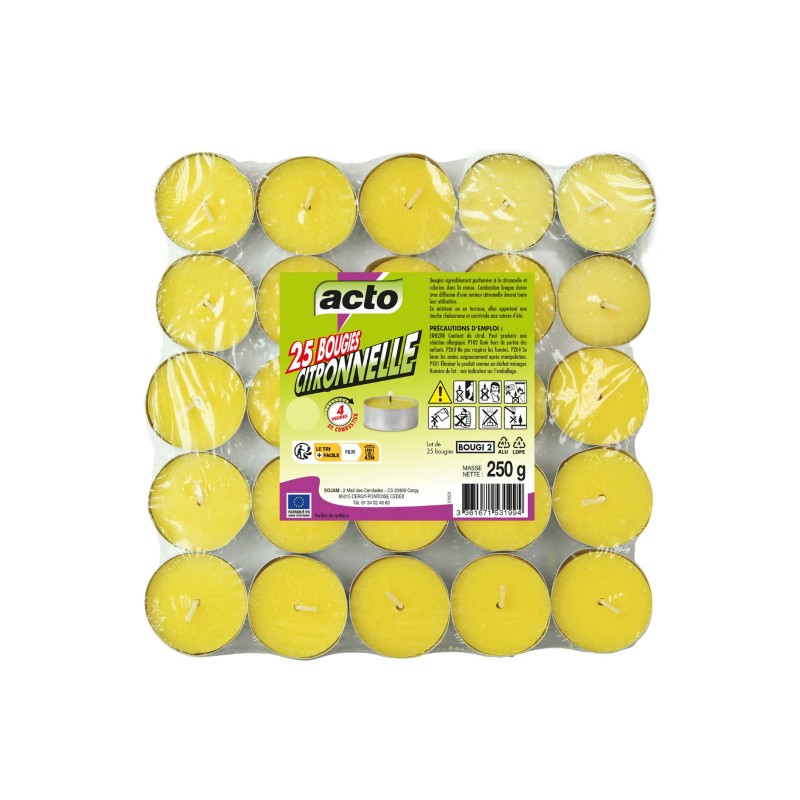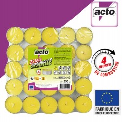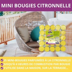 • Lot de 25 mini-bougies parfumées à la citronnelle. • Coupelle en aluminium. • Jusqu'à 4 heures de combustion par bougie. • S'utilise dans la maison, sur la terrasse…|