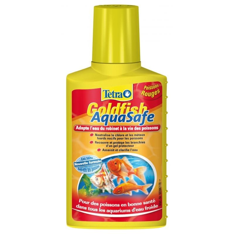 MODE D'EMPLOI: Traitez l'eau du robinet en ajoutant 5 ml de Goldfish AquaSafe pour 10 litres d'eau. À utiliser lors de l'installation d'un nouvel aquarium, d'un changement d'eau ou du transport de vos poissons!