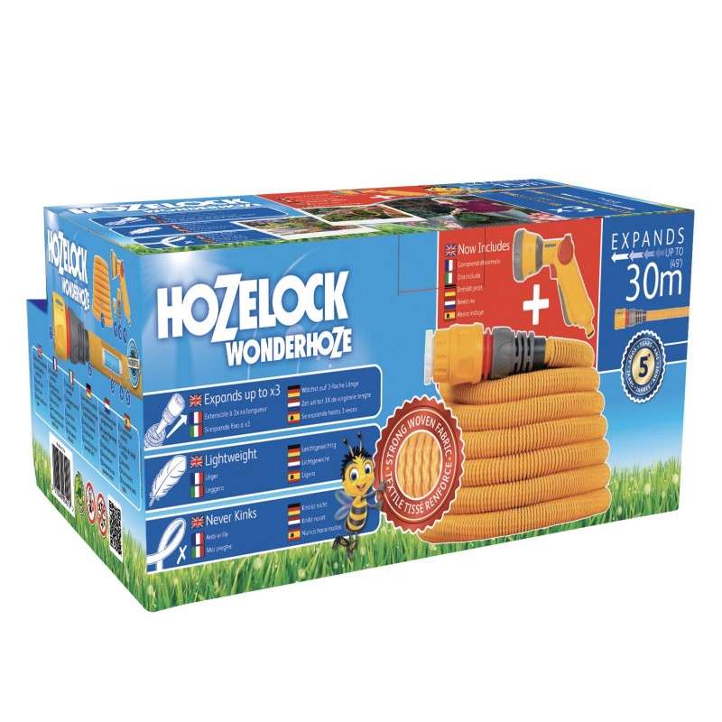 Tuyau extensible WONDERHOZE 30m + pistolet Multispray Enveloppe en textile tissé, s'étire jusqu'à 3x sa longueur pour atteindre 30m max Fourni prêt à l'emploi avec 2 raccords AquaStop et 1 pistolet Multispray| -