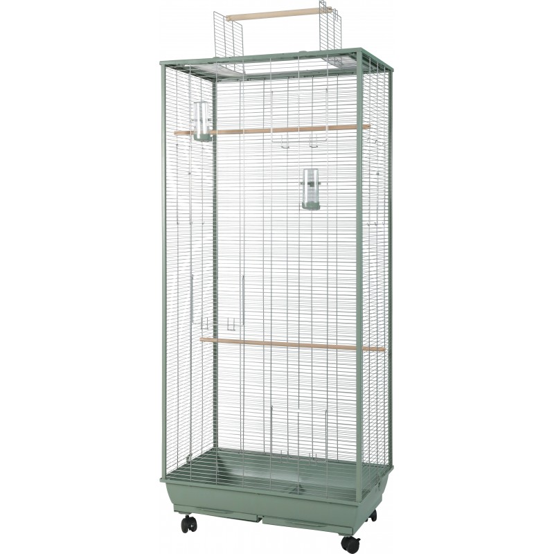 - Équipements: 2 mangeoires/abreuvoirs, 5 perchoirs certifiés FSC® mix 100%, 6 ouvertures dont 2 avec portes coulissantes sur chaque côté pour la connexion, 2 tiroirs amovibles, 4 clips permettant la connexion à une autre cage. 4 roulettes dont 2 avec freins.