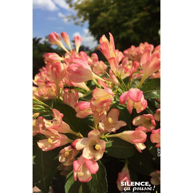 Le plus remontant des Weigelia. Floraison continuelle d'Avril à Septembre, rose pèche et crème. Arbuste en boule bien ramifiée, sans fruits, donc toujours net.
