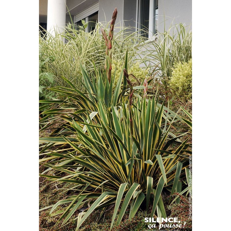 Feuillage rubané vert largement bordé de jaune, non piquant. Nombreuses fleurs blanc crème en été, portées par de grandes tiges dressées de 1 à 1,5 m.
