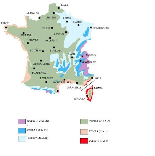 Iklim pegunungan terletak di Prancis di zona 5 hingga 7 (musim panas sedang, tetapi musim dingin dingin dan bersalju).